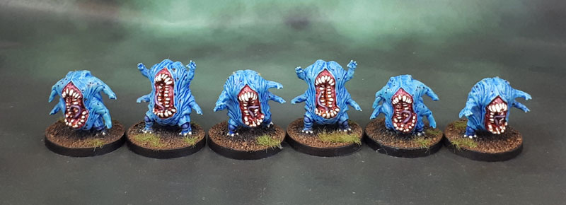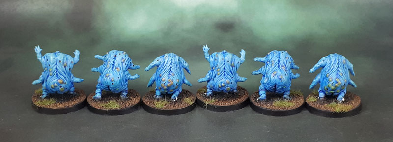 Another half-dozen figures from the 7 Sins Kickstarter today. In this case some fleshy little grubs from the “Greed” faction. As with most of the others, I’ve painted them with the Warhammering in mind. So once again, I’ll just quote myself from a month or two ago – I’m not sure what the “official” paint scheme for these is supposed to be, but let’s face it – I gave (and give) zero fucks about the lore of this particular box of miniatures with a game shoehorned onto it. When I first saw them on the Kickstarter page, I had the very thought that stayed with them to conclusion. Proxy Blue Horrors of Tzeentch.