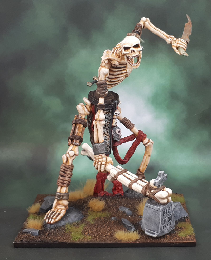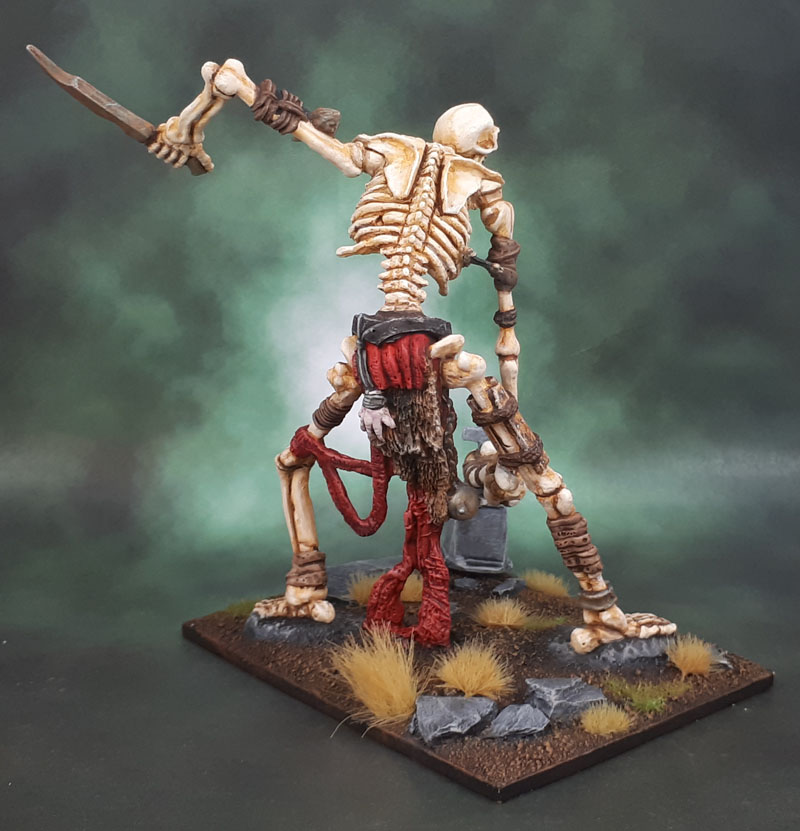 I started this large, skinny fellow a couple of years ago – which you can easily spot by the use of the Square base – based as he is for Kings of War and Marouda’s Undead Army. So why did he take so long to get done? He’s mostly bone, isn’t he? After all, that’s easy enough to do..