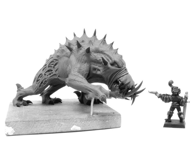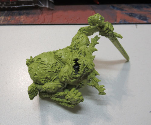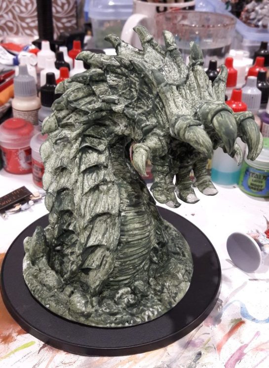 I’m kinda stuck on Goremaw here. After seeing Dave Kay’s painted up as part of Painting Decembruary, I decided to get mine prepped for painting by getting it assembled, then “priming” it in watered down Liquid Greenstuff to cut down on the horrible, sticky, tacky reaction that Bones PVC seems to have with model paints as well as spray primers. So now that’s finally done. Then there’s working out what to do with it – using the stats for the Forge World Dread Maw in Age of Sigmar and perhaps the Spined Chaos Beast for 40k seem reasonable.