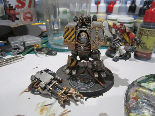So I’ve been doing a little here and there, but last weekend, I noticed that the month was nearly up, and I was in no danger of finishing any of the three models I’d aspired to complete. So… time to get stuck in. Luckily the gloss of Shadow of Mordor had started to come off by that point, and I’ve started hitting the grind wall (please buy an xp boost for this full-price, single-player game!) So it’s not been terribly hard to redirect myself to painting in my time. The focus of most of my attention has been the Iron Warriors Dread, which believe it or not has had a pretty severe overhaul over it’s original paint since the start of the month. Since the scheme is mostly identical, it’s hard to see, but the current model has more tonal qualities in the metal while remaining, well, Iron, and also stuff like weathering, scuffs, heat discolouration, rust and rivets. In fact, all that’s left on it is to complete that Lascannon arm and then some final tweaks on things like lenses.
