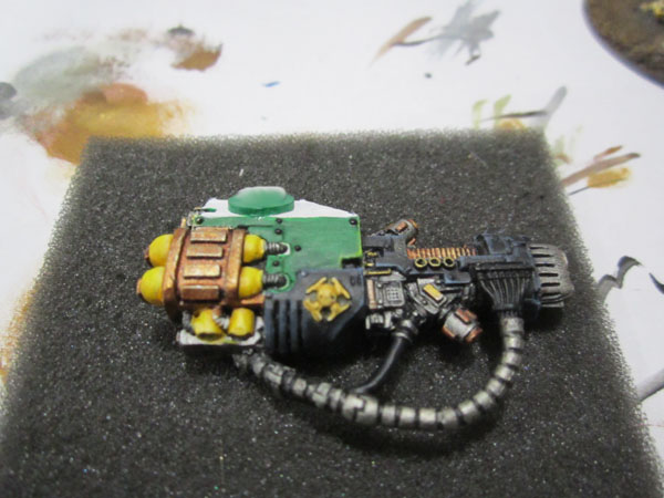Plasma cannon hasn’t had much done to it yet. Just some highlighting and shading on the fuel tank’s metal brackets. Back in the day, this was the only way to get a Plasma Cannon (Heavy Plasma Gun) on a Dread – convert the bloody thing yourself! Out of metal components.