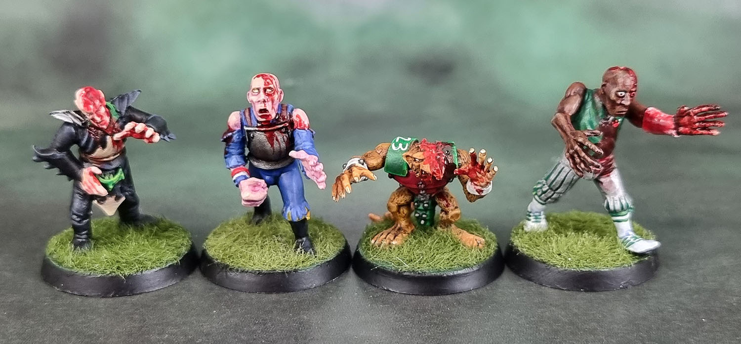 Here’s the second batch of my Undead team, finally completed after something like close to two decades. Zombies! Now, it’ll be pretty obvious that these Zombies are all wearing different strips and are from different races. The reason for that is that when I was building and starting to play this team, I decided that it would be good to base some zombie models on the team members of my opposition teams – that way when I managed to kill off an opposing player on the pitch, I could then replace them with one of the zombie models I’d especially tailored for their team! These models use a combination of various WHFB plastic kits (and some Dark Eldar arms) as well as (obviously) the plastic Zombie kit of the time.