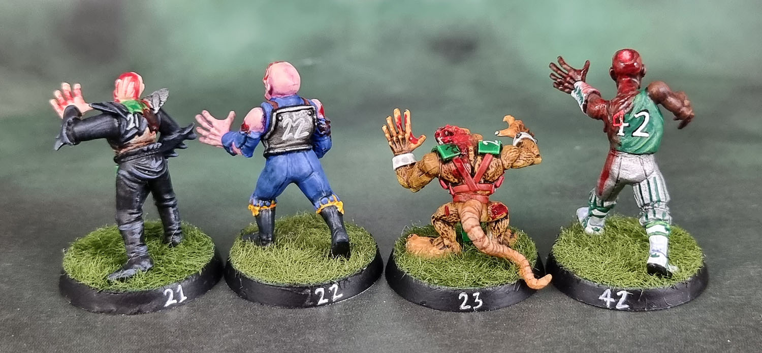 With the exception of the player whose strip was nominally based on the Philadephia Eagles, they have their “new” numbers scrawled onto their gear so as not to interfere with the player numbers of the actual Undead in this squad. While I never got as far as building any “proper” zombies for this team, that’s something I’ll look into once the rest of the players I’ve got on the go are all complete – along with any upgrades to choose a list to make them work with the new, current rules. Thenm again, I could always build more zombies to match the other teams in my own collection (when do-able – ain’t no plastic Big-Hat Chaos Dwarf kits to zombify!) And then, I’ll sort out my Orcs…