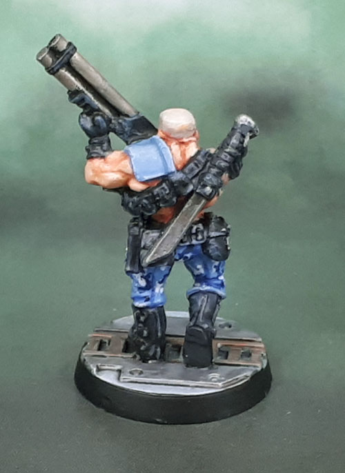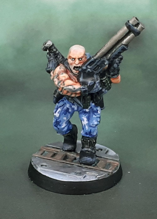 Another Neglected Necromunda model from my gaming days in the 1990’s completed and on show for you today. This guy is a simple conversion of a metal Catachan Jungle Fighter model with his lasgun removed and replaced with a shotgun body and barrel, as well as having had all of his hair and bandanna carved off. As the gang I ran back then was based more on the idea of actual gangs where each member is an individual, rather than the “West Side Story”-uniform-type look of the official Necromunda gangs, I also took that opportunity to use whatever miniatures I damn well pleased. I’ll post up more about it at a later date – once I have more of them completed, but this concept allowed me to have a gang where the members were both male and female. The unifying aspect was having some form of Grendel markings on each model – often tattoos, sometimes scars, sometimes face paint/makeup as well as markings on their gear or weapons where applicable.