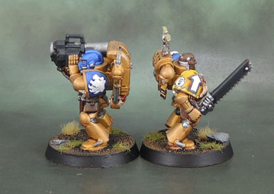 Once again, the Deathwatch parts added to the model are the metal shoulder pad and bolter from the original metal add-on bits, along with a current Deathwatch backpack. On this and the other models in the squad, I’ve attempted to very subtly shade the shoulder with a touch of blur, and the arm with a touch of brown. You probably didn’t notice that on any of these models before I mentioned it, but you have now. So job done, I guess.