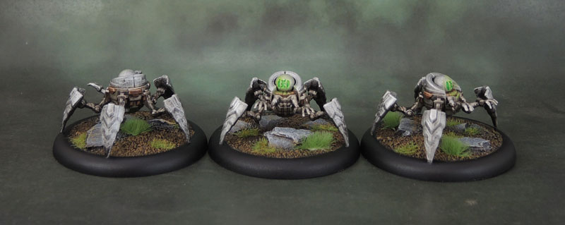 As you can see once again, they’re very simple models. The only assembly was dropping their ball-heads into the sockets. Black Spray, Silver Spray, Black Wash, Silver Drybrush, Chrome Drybrush, Balthazar Gold bits, picked out with Model Air Copper, Strone Tone Wash, White Wash in the lenses, followed by a Moot Green wash for colour. Waystone Green in there on top, and we’re done.