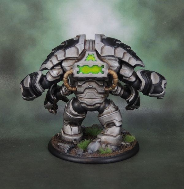 I’ve painted it more or less in line with the Custodians and the Dark Stone Pylons – that is to say, as the “iron”-looking metal of the Custodians combined with black panels reminiscent of the Dark Stone Pylons, with green glowies that all three sets have in common. With just a touch of brass on the cabling to add some additional colour. As it turned out, on a model this size, it still wasn’t enough. The solution was to add some wear via my Vallejo Model Washes – Oiled Earth and Dark Brown. Are they oil stains, corrosion or just dust and grime from being outdoors? Who knows if the metal of Targa corrodes or needs lubrication? Not me. The important thing was that it subtly added a bit more interest to the model and took it away from looking so monochrome (yes, even with the green and brass!)