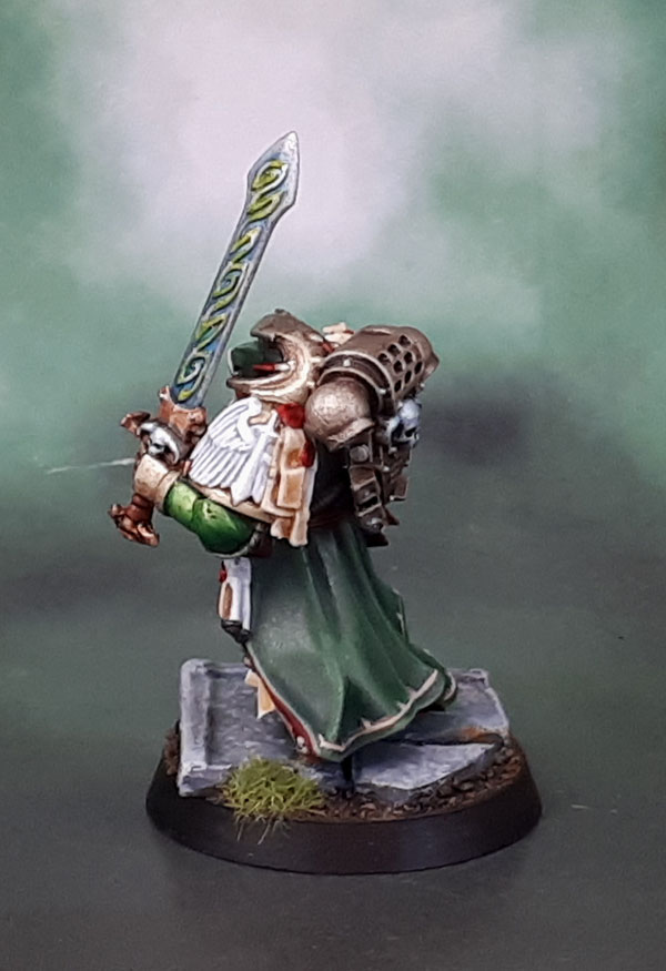 I went with metal armour in a mixture of green and gold in lieu of the “official” blue – which as I’ve mentioned before – I just don’t grok with. I’ve also been partial to giving my Dark Angels green and/or red robes and capes rather than bone, especially so on when there’s a lot of cloth happening.