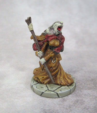 As you can see, I’ve really just tried to get a “good enough” tabletop level on the model. Looking at it in these photos, I can see how I’ve completely skipped higher level highlights on the edges of the robes and clothing. But meh. I dislike this model with it’s muddy, soft “detail” and so I’m calling it good enough. the reddish and black shawl is an attempt to add a little bit of colour to the model, and is also “good enough” should it ever be used as …something in the KoW army. Perhaps she could be stuck in amongst the Zombies. It’d work well enough with that giant gob. Perhaps as an (extra?) Necromancer in Zombicide: Black Plague.