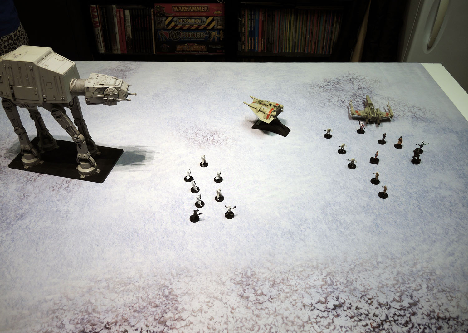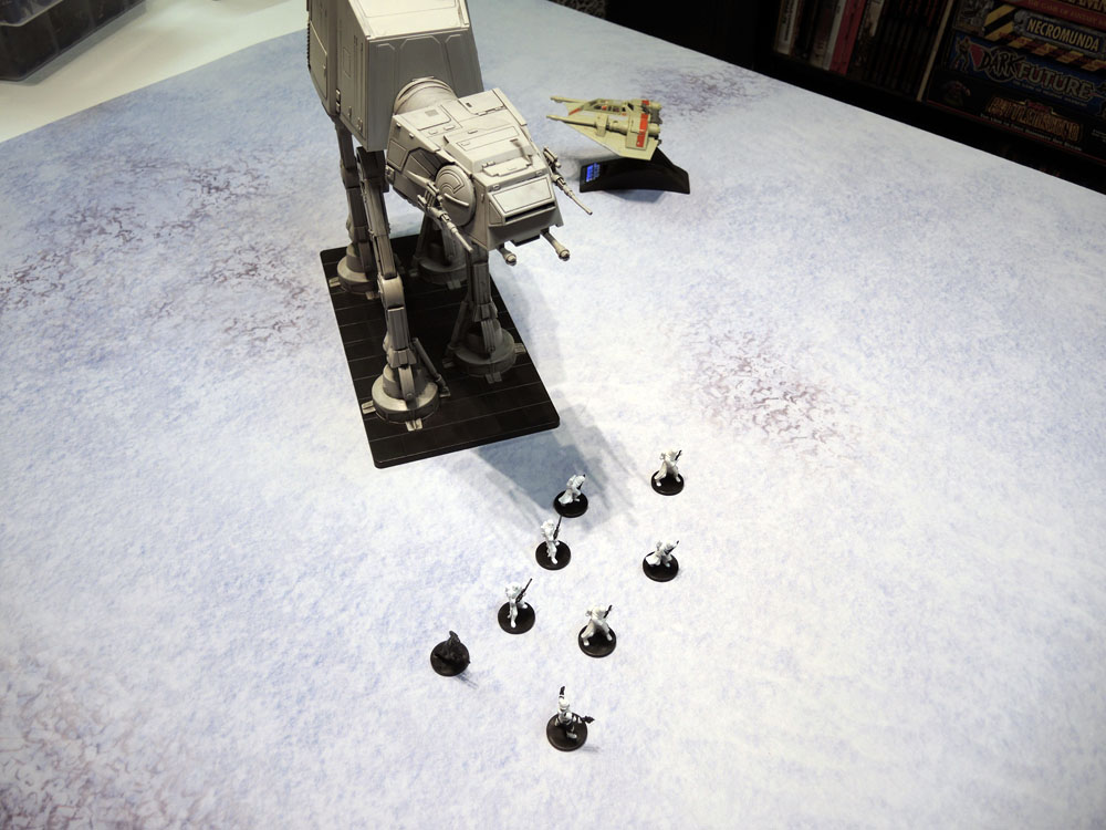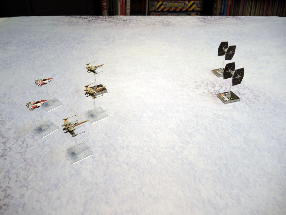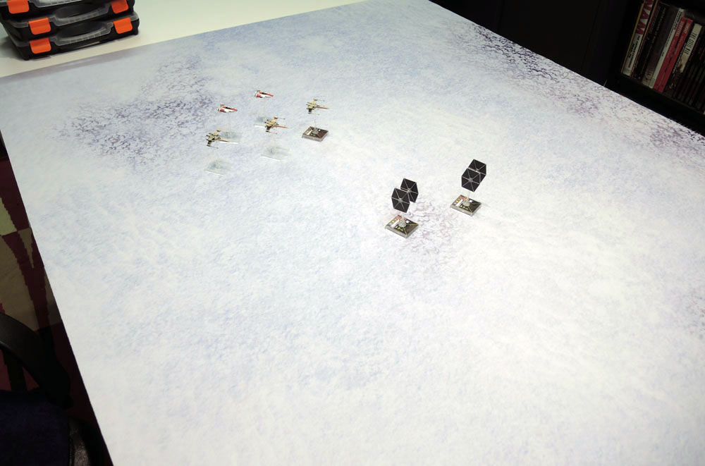 Now I don’t have any models at all based for a snow environment, and even my thoughts around (eventually) playing Frostgrave involved basically ignoring the cold-weather setting but my initial thoughts when it was offered was actually to use it as a second mat for X-Wing, especially given the precedent from the recent films for atmospheric fighter battles.