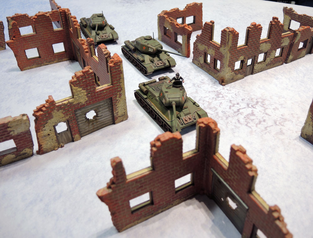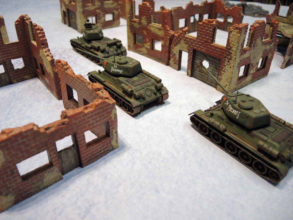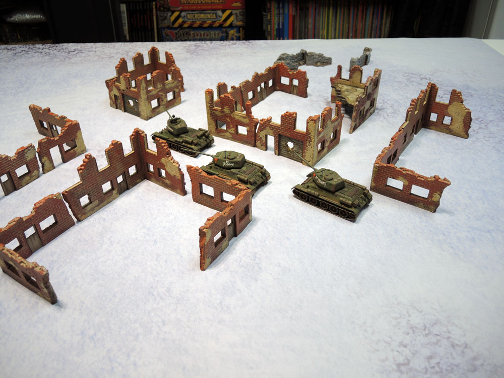 Time for some 28mm models, then. As mentioned before, I lack enough proper painted WW2 to really do much, and I’m completely lacking in snow-themed terrain, so I laid down some old, old Armorcast ruined building corners and my platoon of painted Warlord T-34/85 tanks. The tanks looked alright, though obviously whitewashed would have fit in more effectively.