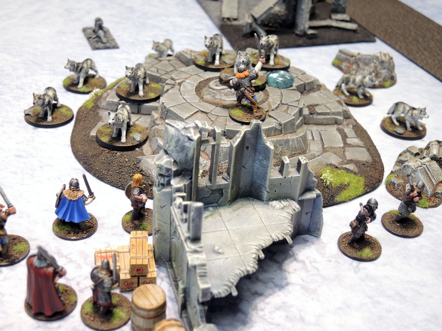 I thought I’d see how the wolves I painted recently look on the mat without vikings and scenery in the way as well, especially given their snow-grey coats. The answer: pretty decent.