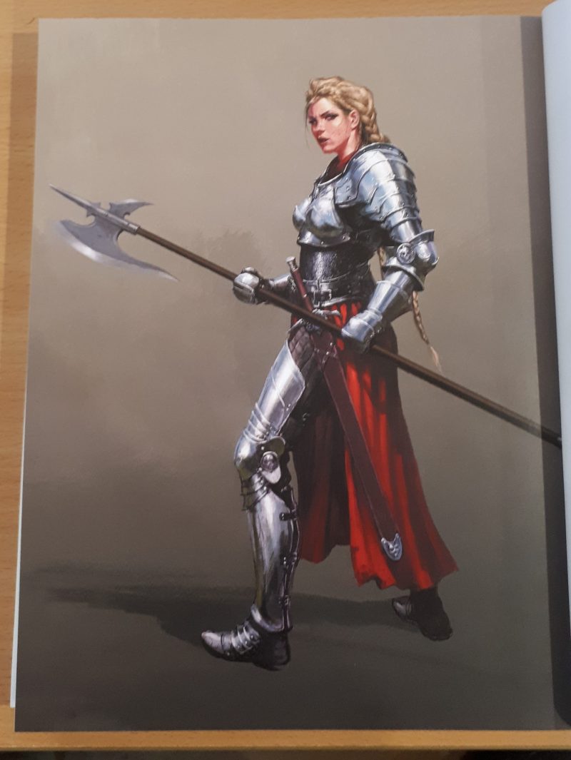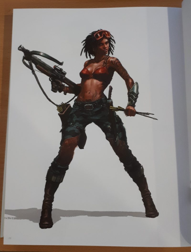 From my own familiarity with a few pieces, I can see that some of the artwork featured were commissioned for various games. Here’s a picture of Marouda in her Zombicide guise of Angry Mary, for example. As noted earlier, there are quite a few series of images that also really feel like “character art” for other games that I’m unfamiliar with – though it does makes perfect sense for an artist known for their work in games.