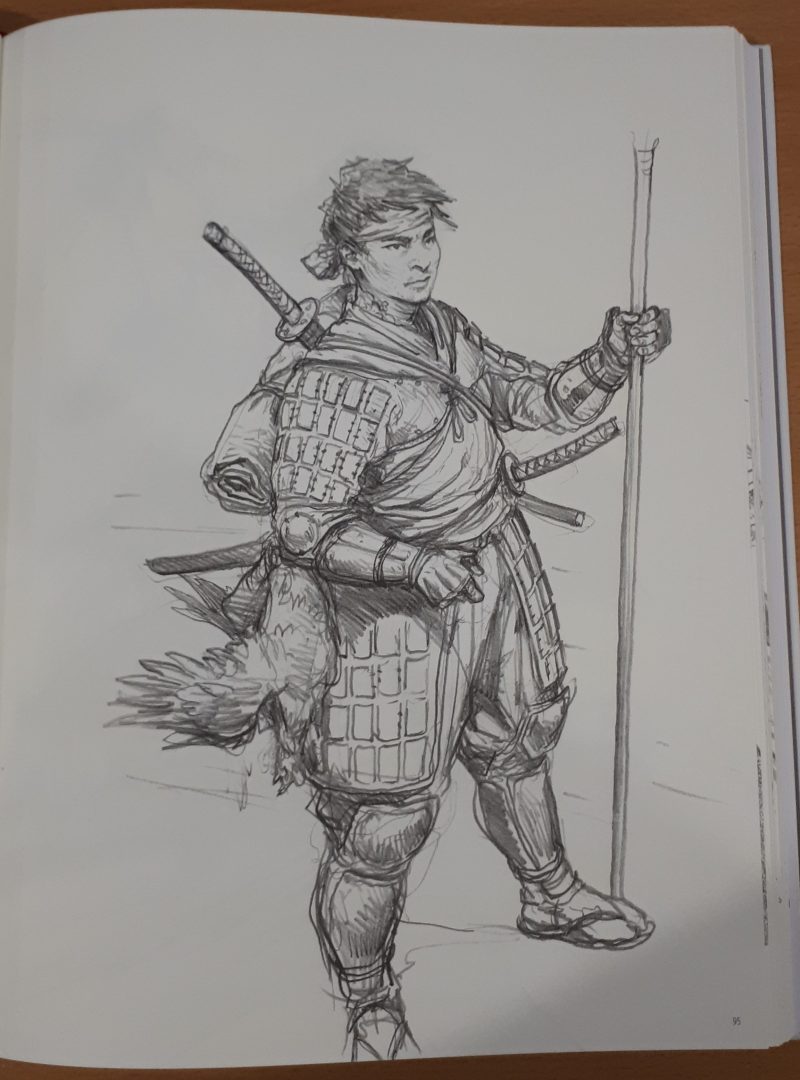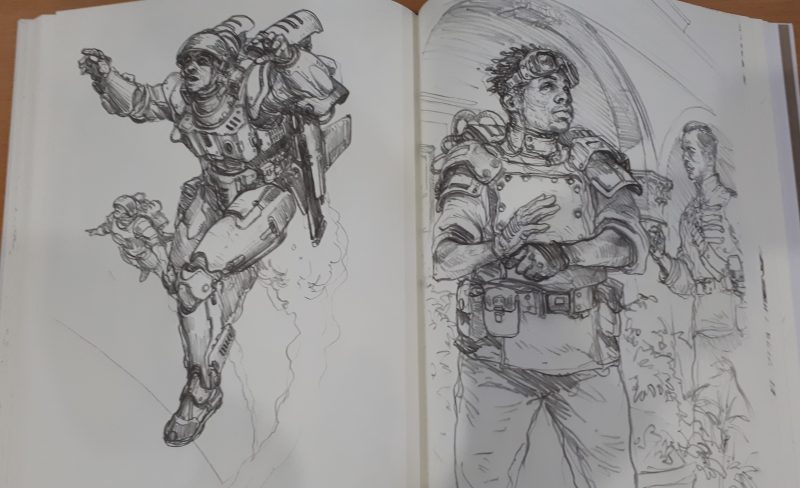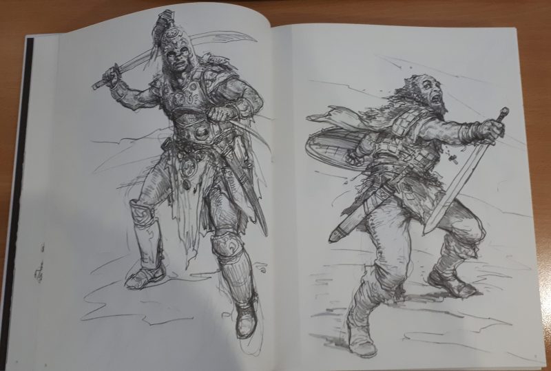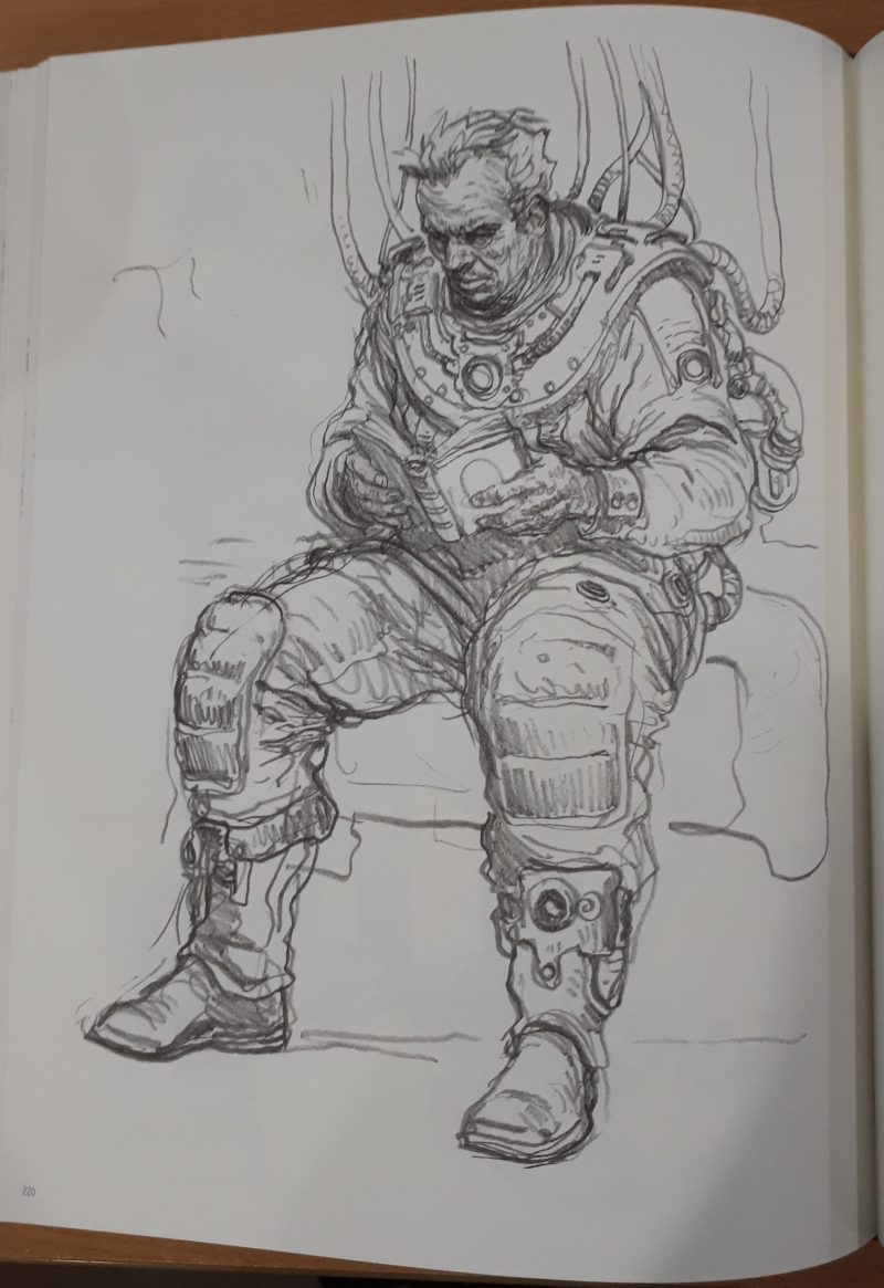 While I’m personally a big fan of his work for GW in particular, and finished, coloured artwork in general and was a little disappointed in the lack of any of the former or more of the latter, I do enjoy “sketchbook” art quite a bit as well, though often I find it more rewarding to look at when juxtaposed with the finished piece, and being able to view the small changes and decisions in the transition from pencil sketch to fully finished, painted art.