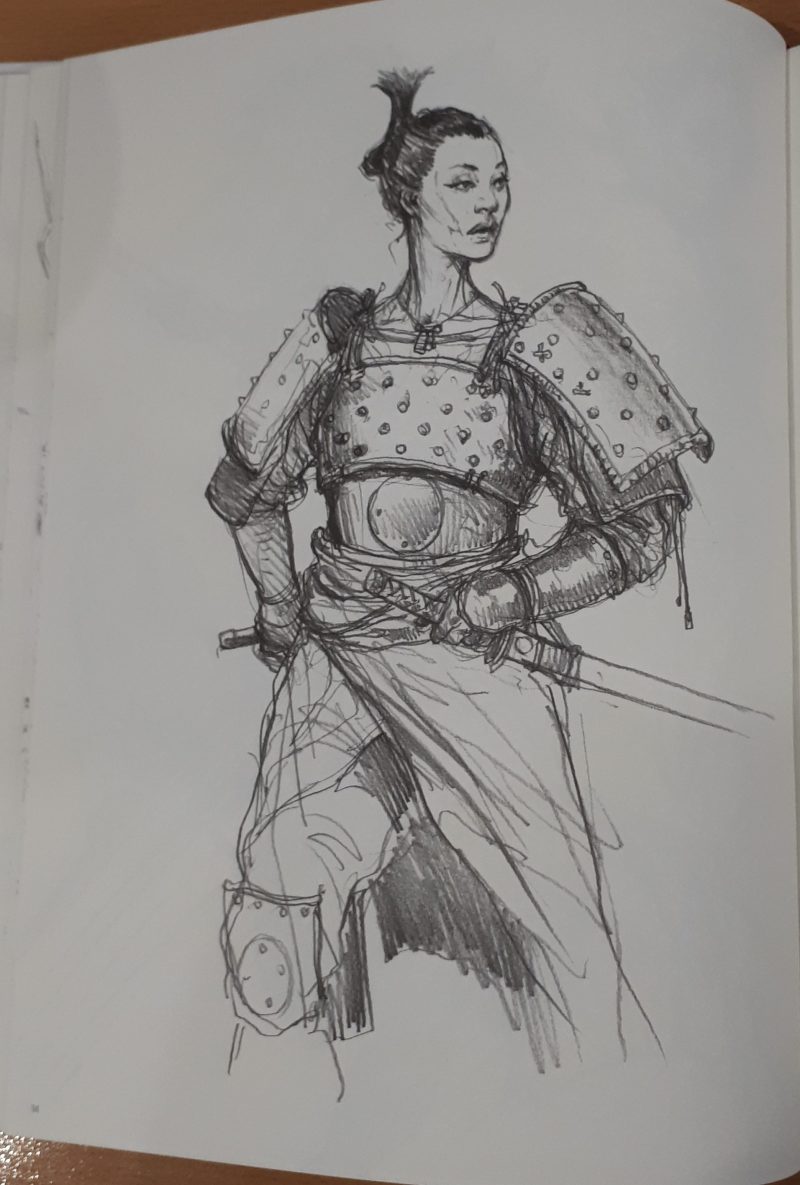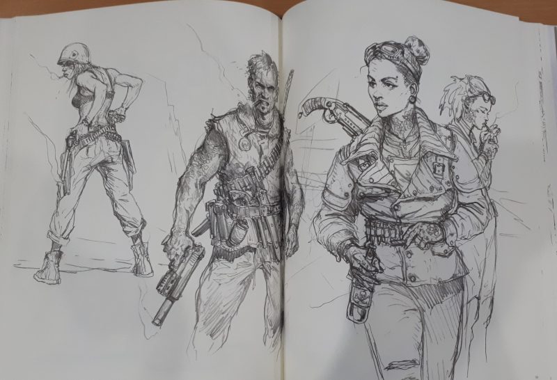As one continues through the book, the sketches and finished pieces within continue to be clustered within loose “themes”. There are Pirates, Victorian folk, Napoleonic troops, Wild West, Samurai, Mobsters – many of which have fantasy and/or sci-fi elements mixed in. Comic heroes, characters smoking, armoured characters, and on it goes…