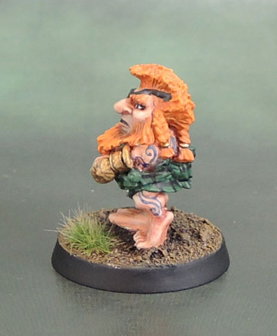 Since he’s wearing not only a kilt but a fly plaid over his shoulder, I went for a simple tartan using a dark, muted green. Since that’s all he appears to be wearing, aside from some jewelry, the rest is simply tattoos, skin and tattoos. I’m happy with the look of the tattoos here for a change, and that’s something that I can at least say I’ve improved on to a point of satisfaction as I’ve worked my way through these slayers. Tattoo colour and stubble. Tattoos. I certainly used that word a lot here.