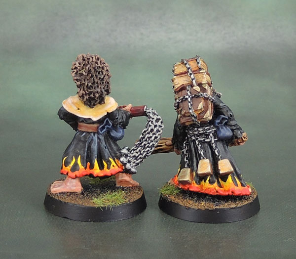 Paint-wise, there’s nothing amazingly revelatory going on here. I did use a variety of reds in order to try to define the different textures of cloth, feather and leather. A touch of green to contrast as a spot colour on the two of them.