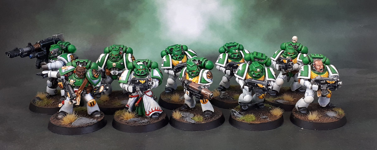 III Squad (Tactical) was also started way back when – once I found I didn’t have enough MK VI Corvus “beakie” heads, I decided to suck it up and have a more “normal” looking marine army with a variety of armour variants mixed in. When going through the models I needed to finish, I found that I had more than enough models to finish this squad, which confused me a little at first until I figured out that a pair of figures amongst them must have been destined for Squad II (*Corvus) – so as I mentioned a little earlier, I went with anything having a corvus-style helmet to fill out that squad. In the end, though – neither of those models ended up in the final version of Squad III.