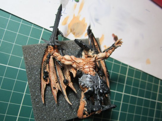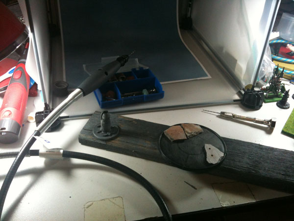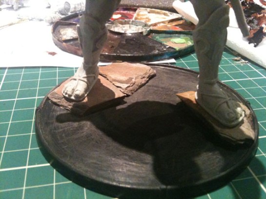 I spent a bit of time today on the Talos. Touched up the black primer from last night, then went over it with Vallejo German Red Brown Primer. Next I found I was base coating it, and a bit later I was drybrushing the metallic layers, painting the slate and finally the dirt. So it’s (almost) finished.