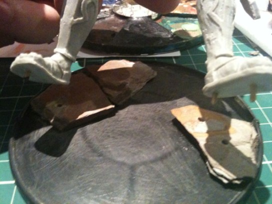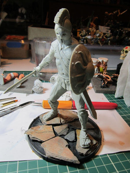 Now – as Cash mentioned in the comments when I was looking to work out which models I’d do for December, this figure wasn’t a stretch of my skills by any means. The assembly was a bit trying, so I could say I learned a little there on the use of my Dremel, which I was given as a birthday gift from Marouda several years ago but have barely used. But the figure… well, he’s just carefully drybrushed in layers. It’s a big, rough-cast bronze statue. Drybrushing is the perfect technique. Sure it was careful, and there are spot highlights, but drybrushing is drybrushing. And there’s nothing wrong with that. Now, though – I need to work out what to do to properly finish him.