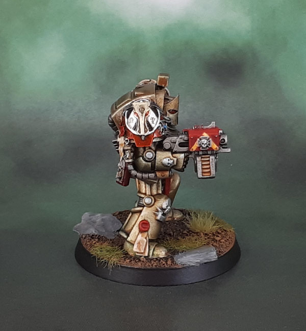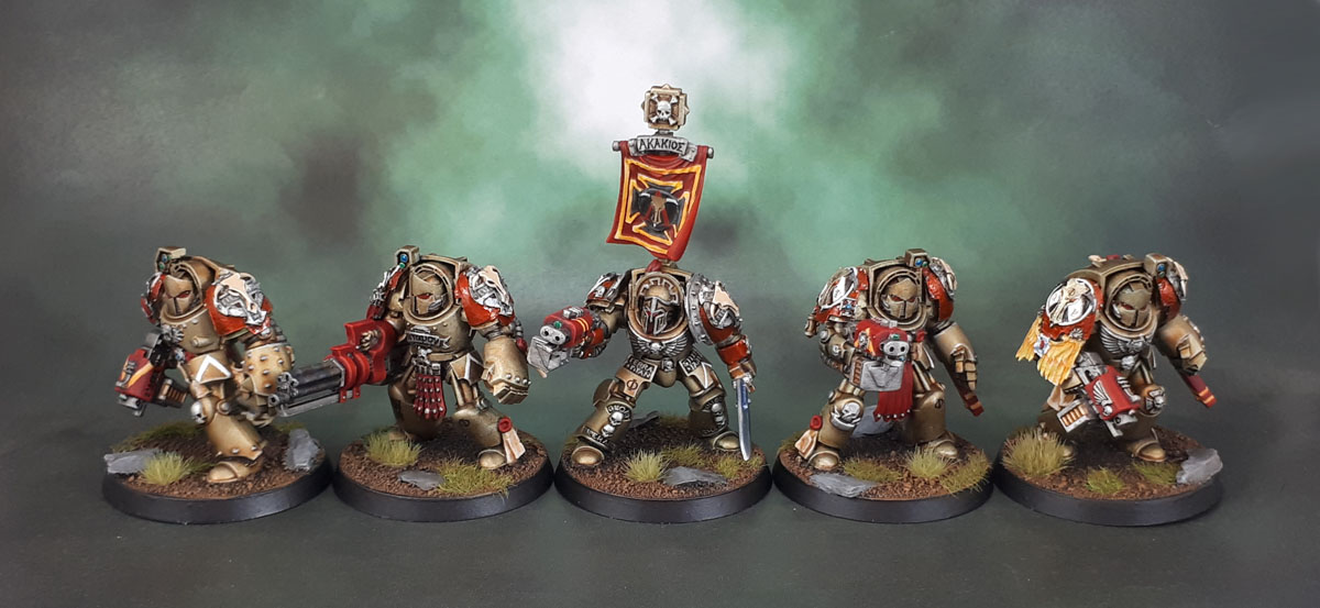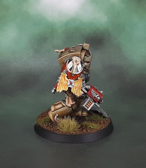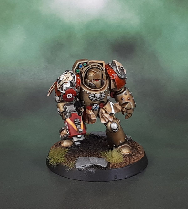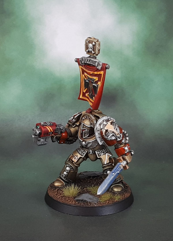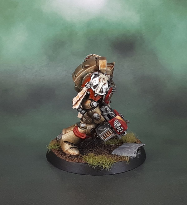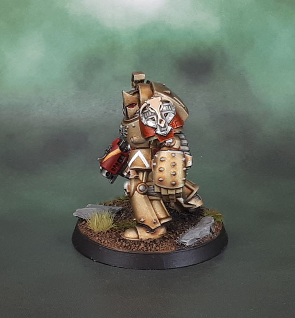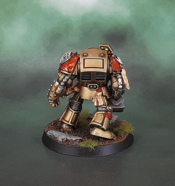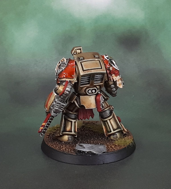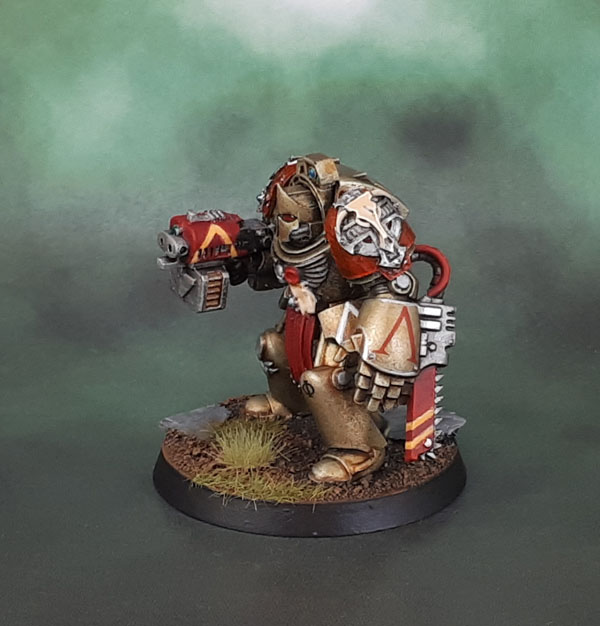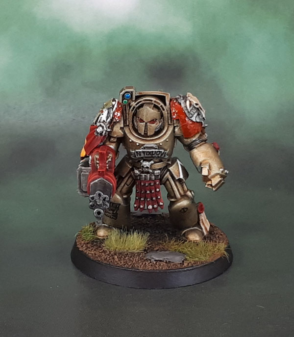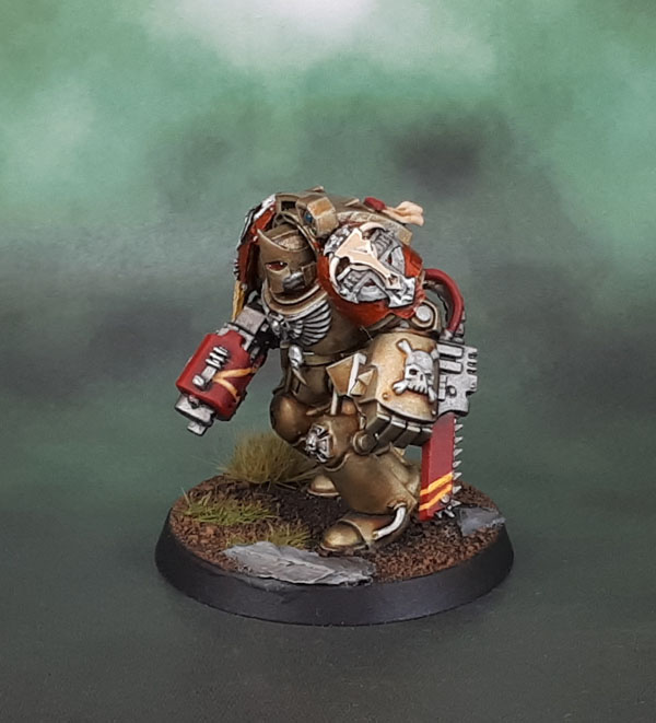 One thing that I was a bit stuck on as I was finalising these models was whether to go laquered red on their Chainfists and Power Fists as well as their outer Pauldrons. In the end, I left them in the brassy bronze, but felt that this guy needed a bit more to make it more interesting, so he got a lambda in red to finish it off. Because the lambda on his weapon and the lambda on his fauld wasn’t enough to get the whole “SPACE SPARTAN” thing across. Actually, it was just to have a bit of appropriate visual interest there. 😉
