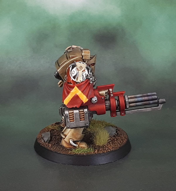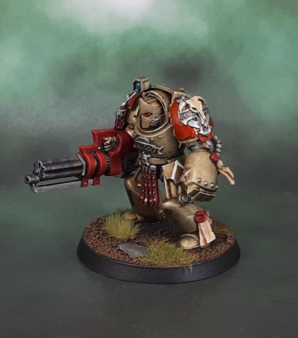 Brother Damon (yes, that’s what it says on his chest) – (“to tame, to subdue” and euphemistically “to kill.”) is the Squad’s heavy gunner, armed with the ubiquitous Assault Cannon. He’s pretty much a stock model, aside from the Forge World Pauldrons and the head and pteruges from Anvil Industry. He’s also a member of an ancient warrior cult for those who wage war using rapid firing heavy weapons with it’s origins in ancient Terra, evidenced by the iconography on his armour.