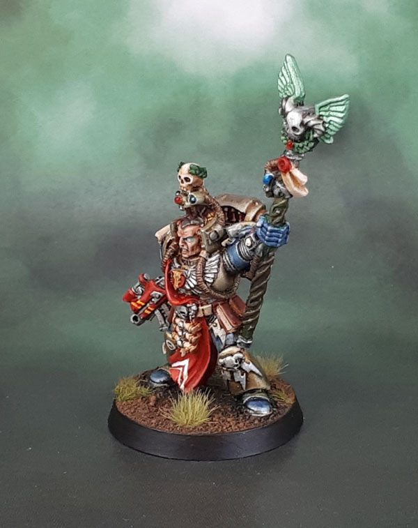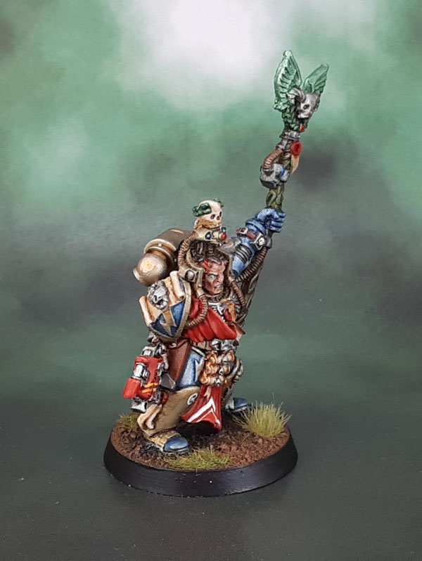 I like metallic blue with some gradient for Power Swords, generally speaking. The attempt to create a nice, enamelled red on his pauldrons and bracers was achieved by doing the usual brassy-bronze armour, then going over it with two coats of GW’s Spiritstone Red. There’s still very much a metallic sheen to them that doesn’t come across fully in the photographs.