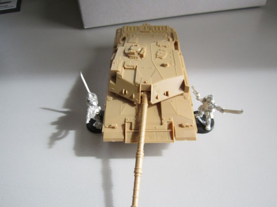 A couple of in-box and sprue-in bag shots. Nothing too exciting here. Tracks are rubbery plastic, as is not uncommon for tracked vehicle model kits. So far, so normal. I also took a bunch of comparison photos with some 40k models, so people can get an accurate look at the size. Bear in mind in these pics the wheels and tracks aren’t assembled on the Challenger, so the actual kit would end up a bit taller.