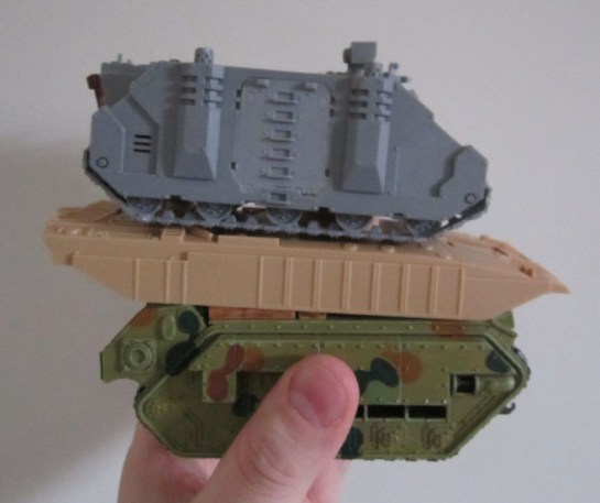 Yes, I took a whole lot of photos. Mostly because I went with what I personally like to be able to see when looking at kits like this on the web, so some comparisons with other commonly-used vehicles (sorry, I couldn’t find my Russes) and some of the models most likely to be spending quality time with it (sorry, my Mantic Corporation guys aren’t built yet, and my half-painted moderns are still hiding out somewhere since I moved).