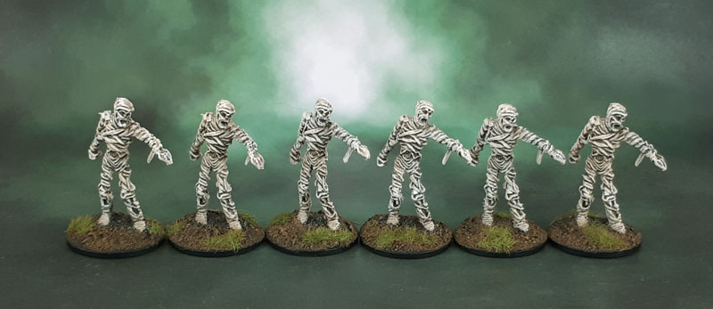 A bit of a mini-update today. A small unit of mummies. These were painted some unknown number of years ago on square green-flocked based, and rebased to my current style last year. I’m not even sure if they got touched up in terms of paint. Later last year they were drafted into my wife’s KoW Undead army, when I had to create an undead army out of existing painted figures in a day. Of course, KoW “officially” uses 20mm bases on mummies, so a Troop of five is on a 100mm frontage x 20mm depth stand. Four mummies based on 25mm round bases gives me the same frontage and +5mm depth – which is well within reasonable for a movement tray, so good enough for our games.