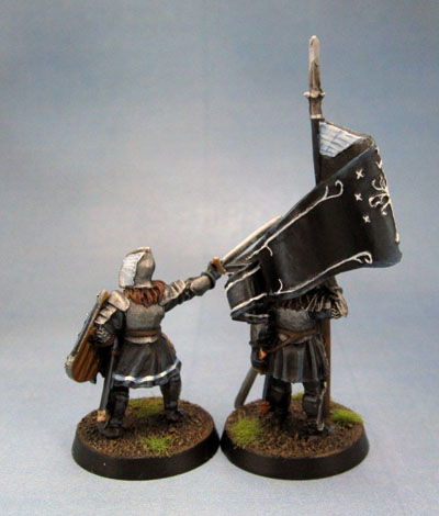 It turned out that I only had 10 Osgiliath Veterans, so when I spent some time late last year trying to sort out my unpainted Gondor models, I decided to give them a couple of models to act as command, rather than buy more models. I threw a Gondor standard bearer and a spare Faramir into a baggie, and job done! I’ve got another of the same Faramir model, which I’d painted several years ago, after I’d started this blog but before I started really updating it with any frequency. He was of course painted to fit in as a commander of the Gondor army, and occasionally managed to take the field. It can be seen here. This time, I wanted the Faramir model to be very much part of the Veteran unit, and so he was painted with the same palette of greys, with just a touch of AP Wolf Grey mixed into the top highlights. I also added some gold trim on his armour and the white trim to his skirts to help distinguish him as the unit commander on the tabletop. While the Faramir is a nicely understated model, it’s not really a stand-out model for someone as important as Faramir.