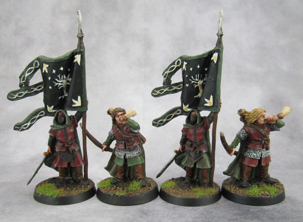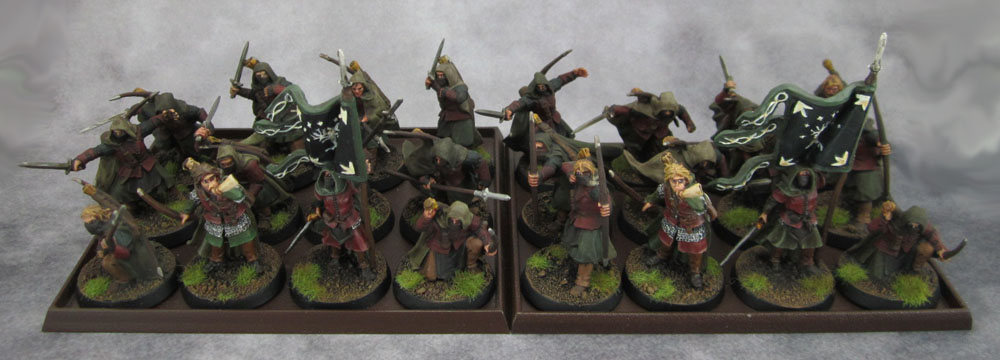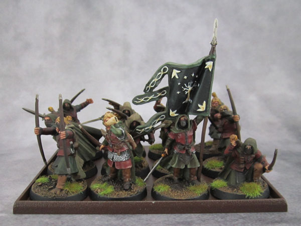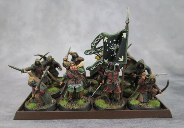They’re reasonable models, though the sculpts are nothing special. Solidly on a par with many Historical sculpts – though far more expensive – and not up to the same high standard that much of the LotR range is. It appears that I started them about a year ago, and finally forced myself to get rid of them from my painting desk a couple of weeks ago by knuckling down and completing them. I’m not sure why GW decided to go with the Blackroot Vale moniker, as they’re not really correct for those troops anyway and Faramir’s Rangers lacked a command section for WotR or so forth. In my thinking they’ll be used (thematically) as part of the wider force of the Rangers of Osgilliath.
