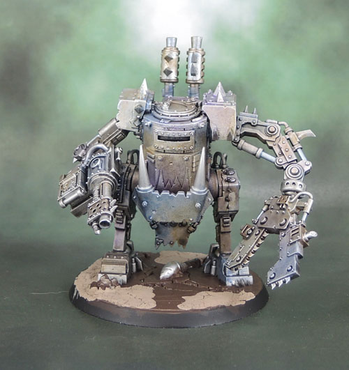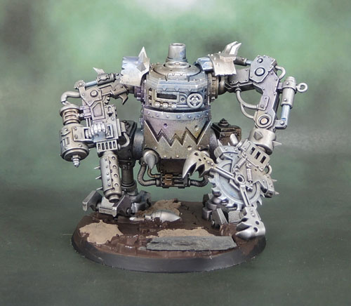 Now as effective as the discolouration looks, I’m not sure what to do next. Which is another one of the reasons these figures have sat for awhile. While my force is pretty much “Camo/Military/Blood Axe” themed, I’ve also been leaving metal items and armour bits unpainted so far. I’d most likely be painting some of the panels on the vehicles when I get to them, and even with these walkers darkened and dirtied-up some more, they could well still look a bit too “Rainbow Brite” if left untouched.