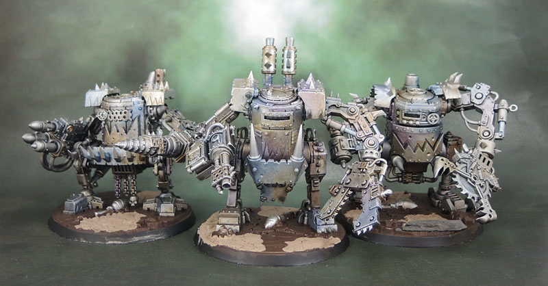 So, miniatures. I’ve had this trio of Ork Killer Kans for a few years. Purchased from eBay already assembled, I sprayed them in metallics some months ago, and they’ve sat in a tub waiting for me to finish the actual Ork force first. Since I’m stressed as fuck lately, and probably not going to be doing my best fine detail work, I’ve decided to work on broad details on these larger models to keep my mind occupied.