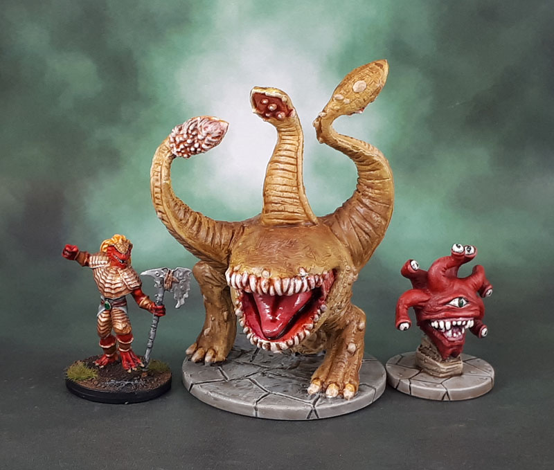 Here’s our scale shot alongside the other cough-noise monster – the Gauth – as well as the Dancing Dragonborn. As the Otyugh is bigger than an ogre, and is most definitely a monster model, I’m sumitting it for Ann’s Miniatures of Magnitude Challenge for May & June. Hopefully I’ll get a few more done before the end of this month that also fit the bill!